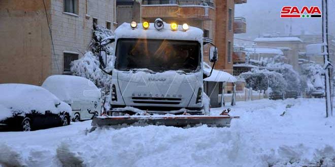 من جهته لفت مدير المدينة بمجلس مدينة السويداء ثائر الصالح إلى أن ورشات واليات مجلس المدينة بالتعاون مع كاسحة الثلوج في فرع المرور واليات مؤسستي الإنشاءات العسكرية والمشاريع المائية تعمل منذ الصباح على فتح الطرقات المحورية داخل المدينة ولا سيما المؤدية إلى الأفران والمشفى مع تواصل عمليات إزالة الثلوج.
