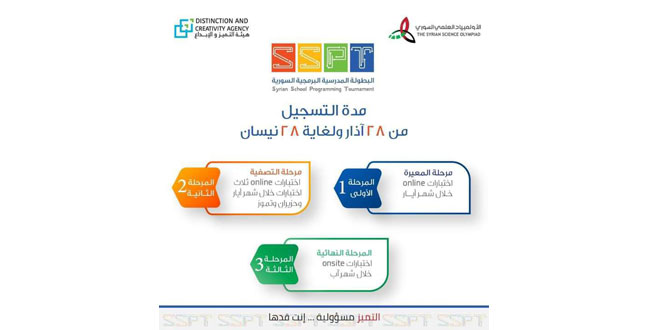 ولفتت الهيئة في بيانها إلى أن التسجيل للمشاركة مستمر حتى الـ28 من نيسان القادم مبينةً أن البطولة تهدف إلى توسيع الاهتمام بالبرمجة التنافسية لدى طلبة المدارس واكتشاف المتميزين ورعايتهم.