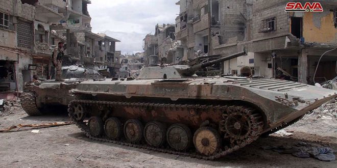 وكانت وحدات الجيش وسعت أمس نطاق سيطرتها شمال غرب حي الحجر الأسود بعد معارك عنيفة مع الإرهابيين سيطرت خلالها على ثانوية تقنية الحاسوب وعدد من كتل الأبنية.