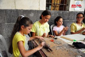 اطلع عشرون طفلاً على فن الخزف ومراحل صناعته خلال ورشة عمل أقامتها الفنانة التشكيلية سناء فريد بمرسمها ترانيم خزفية في خان أسعد باشا.