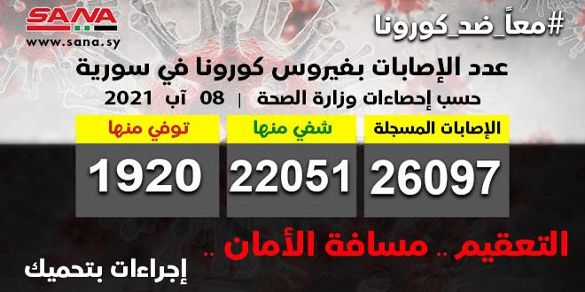 وأوضحت الوزارة في بيان تلقت سانا نسخة منه أن عدد الإصابات المسجلة في سورية بلغ حتى الآن 26097 شفيت منها 22051 وتوفيت 1920 حالة.