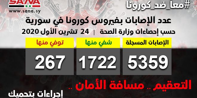 وأوضحت الوزارة في بيان تلقت سانا نسخة منه أن حصيلة الإصابات المسجلة في سورية بلغت حتى الآن 5359 شفيت منها 1722 وتوفيت 267 حالة.