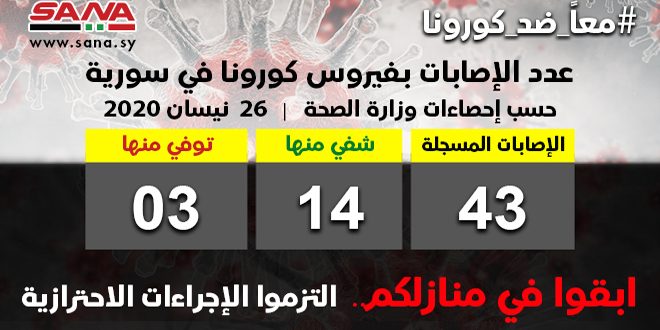 وقالت الوزارة في بيان لها تلقت سانا نسخة منه إنه تم شفاء ثلاث حالات من الإصابات المسجلة بفيروس كورونا ليرتفع عدد حالات الشفاء إلى 14 حالة فيما تم تسجيل إصابة جديدة بالفيروس ليرتفع عدد الإصابات المسجلة في سورية إلى 43 إصابة.