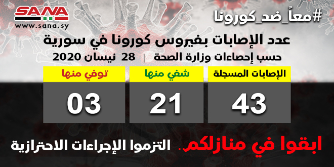 وقالت الوزارة في بيان تلقت سانا نسخة منه إنه تم شفاء حالتين من الإصابات المسجلة بفيروس كورونا ليرتفع عدد حالات الشفاء إلى 21 حالة موضحة أن عدد الإصابات المسجلة بالفيروس حتى اليوم بلغت 43 إصابة شفيت منها 21 إصابة وتوفيت ثلاث حالات.