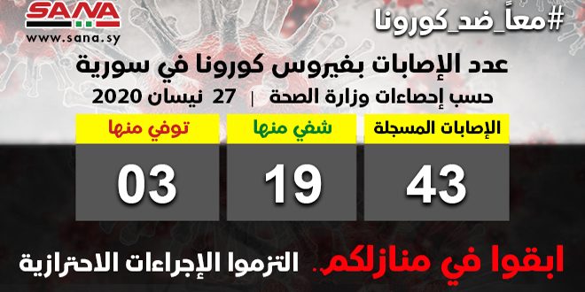 ولفتت الوزارة في بيان تلقت سانا نسخة منه إلى أن عدد الإصابات المسجلة بفيروس كورونا في سورية بلغ حتى اليوم 43 اصابة شفيت منها 19 إصابة وتوفيت ثلاث حالات.