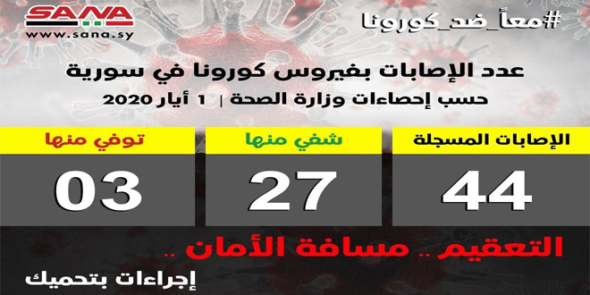 يشار إلى أنه تم تسجيل أول إصابة بالفيروس في سورية في الثاني والعشرين من شهر آذار الماضي لشخص قادم من خارج البلاد.