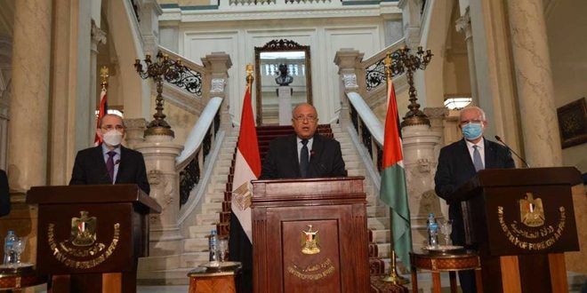 جدد وزراء الخارجية المصري سامح شكري والفلسطيني رياض المالكى والأردني أيمن الصفدي التأكيد على أن القضية الفلسطينية هي القضية العربية المركزية وأن قرارات الشرعية الدولية ذات العلاقة تمثل المرجعيات المعتمدة للتفاوض نحو إحلال السلام في المنطقة.