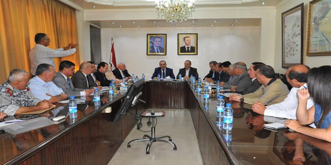 بحث وزير الإدارة المحلية والبيئة المهندس حسين مخلوف مع أعضاء المكتب التنفيذي في محافظة ريف دمشق ومديري المؤسسات الخدمية آليات رفع مستوى الخدمات للمواطنين في المحافظة وسبل زيادة المشاريع الاستثمارية والتنموية فيها وتنمية المناطق الحرفية والصناعية بما يدفع عملية الإنتاج إلى الأمام.