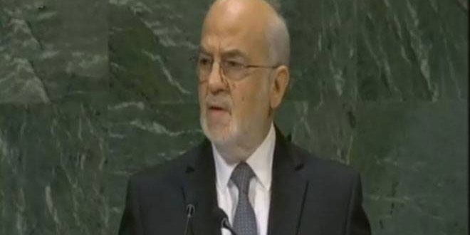 وجدد الجعفري في كلمة له أمام الجمعية العامة للأمم المتحدة في دورتها الثالثة والسبعين دعم بلاده لإحلال الأمن والاستقرار في سورية والحفاظ على وحدة أراضيها داعيا إلى حل سياسي متوازن للأزمة فيها وبين وزير الخارجية العراقي أن النصر العسكري على الإرهاب لا يعني بالضرورة نهايته بالكامل مؤكدا ضرورة مواجهة الأسباب التي أدت إلى نشأته وإلى تكاتف المجتمع الدولي في تحصين الشعوب من آفاته.
