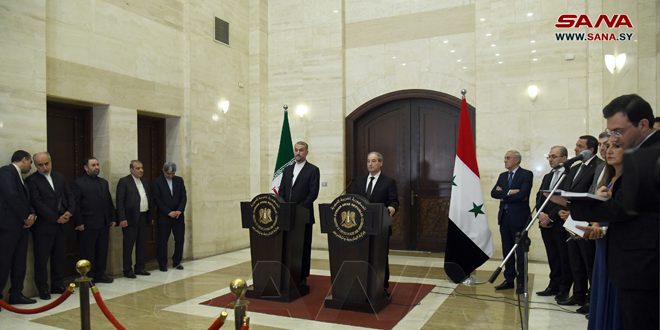 وقال المقداد خلال مؤتمر صحفي اليوم مع نظيره الإيراني حسين أمير عبد اللهيان في مبنى وزارة الخارجية: أجرينا مباحثات مطولة حول الكثير من القضايا والعلاقات الثنائية التي تسير دائماً باتجاه إيجابي، إضافة إلى متابعة تنفيذ الاتفاقات التي تم توقيعها خلال الزيارة الأخيرة للرئيس الإيراني إبراهيم رئيسي إلى دمشق، ووجدنا أن الاجتماع الأخير للجنة المشتركة السورية الإيرانية في طهران كان مثمراً في إطار متابعة الجهود والاتفاقات التي تم توقيعها بحضور السيد الرئيس بشار الأسد والرئيس الإيراني، كما ناقشنا التحديات التي يتعرض لها بلدانا واستمرار السياسات العدوانية القديمة الجديدة من قبل الدول الغربية وفي مقدمتها الولايات المتحدة وخاصة الاستثمار في الإرهاب من أجل تحقيق أهداف وغايات سياسية معروفة لكل شعوب المنطقة والعالم.