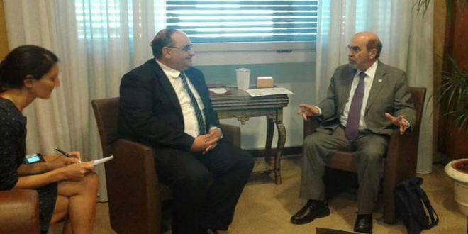 بحث وزير الزراعة والإصلاح الزراعي المهندس أحمد القادري مع المدير العام لمنظمة الأغذية والزراعة للأمم المتحدة “الفاو” جوزيه دا سيلفيا على هامش أعمال مؤتمرها الأربعين في العاصمة الإيطالية روما واقع التعاون المشترك وسبل تطويره بين الجمهورية العربية السورية والمنظمة .