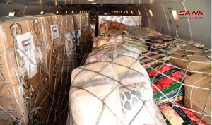 ووصلت إلى مطار اللاذقية الدولي طائرتا مساعدات إماراتيتان، تحمل الأولى 28 طناً من المواد الغذائية وفقاً لما أوضحه مدير مطار اللاذقية المهندس زياد الطويل في تصريح لمراسلة سانا، فيما تحمل الطائرة الثانية نحو 22.7 طناً من المواد الغذائية والإغاثية للمتضررين من الزلزال.