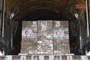 وإلى مطار حلب الدولي وصلت طائرتا مساعدات إماراتيتان، تحمل الاولى 22 طناً من المواد الغذائية والحرامات، فيما تحمل الثانية 29.5 طناً من المواد الإغاثية.