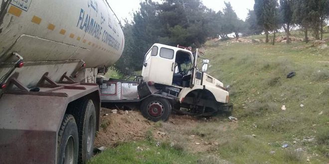 توفي شخصان وأصيب ثلاثة آخرون اليوم في حادث تصادم سيارة مع صهريج غاز على طريق حمص/تدمر بالقرب من مفرق الهزة.