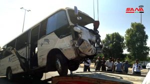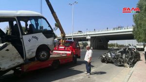 وذكر العميد آصف حبابة معاون قائد فوج إطفاء دمشق لمراسلة سانا أن سيارة خاصة نوع (هونداي أفانتي) اصطدمت بحافلة لنقل الركاب 24 راكباً على الطريق الواصل بين دمشق وبيروت ما أدى إلى وفاة سائق السيارة وإصابة 11 شخصاً بينهم أطفال أسعفوا الى مشفيي المواساة والرازي لتلقي العلاج.