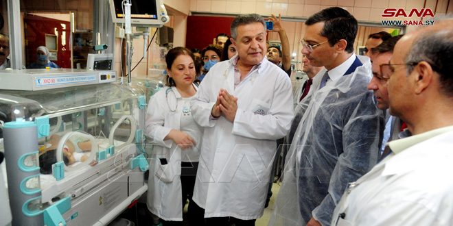 واطلع الوفد خلال زيارته التي تأتي ضمن فعاليات الاجتماع الخامس السوري الروسي المشترك لمتابعة المؤتمر الدولي حول عودة اللاجئين والمهجرين السوريين على عدد من أقسام المشفى والخدمات التي تقدم للمراجعين من تشخيص وعلاج دوائي وجراحي.
