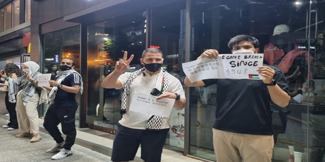 نظم عدد من أبناء الجاليات العربية وجنسيات أخرى المقيمين في كوريا الجنوبية وقفة احتجاجية في العاصمة سيئول تنديداً بالعدوان الإسرائيلي على الشعب الفلسطيني.