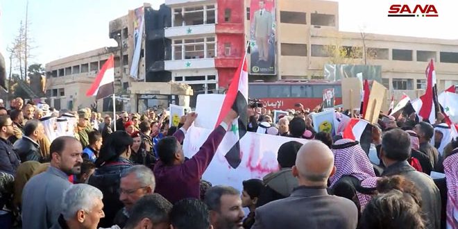 وعبر المشاركون في الوقفة الاحتجاجية عن فخرهم ببطولات الجيش العربي السوري في حربه ضد الإرهاب مؤكدين أن دماء الشهداء والجرحى الأبطال تنير طريق المستقبل المشرق الآمن الذي يعيش فيه السوريون بأمن واستقرار.