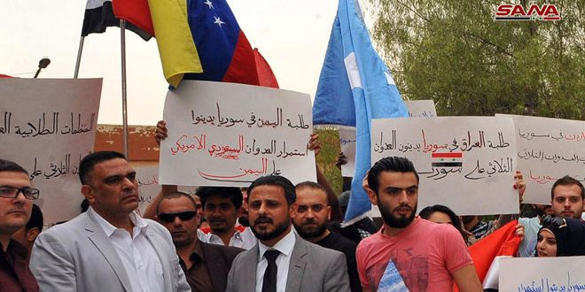 بدورهم عدد من الطلاب العرب المشاركين بالوقفة أكدوا أن صوت الشباب العربي وطلاب جامعة دمشق سيبقى عاليا دائما في وجه كل من يريد النيل من سورية واليمن ومواقفهما واصفين الأمم المتحدة بأنها اداة لتنفيذ غايات الولايات المتحدة الأمريكية التي يشهد تاريخها على دعمها للإرهاب.