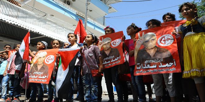وردد المشاركون الذين رفعوا أعلام فلسطين وسورية والمقاومة هتافات تؤكد على الحقوق الثابتة للشعب الفلسطيني مشددين على أن الاحتلال الإسرائيلي ما زال يضرب عرض الحائط كل قرارات الشرعية الدولية ذات الصلة بالقضية الفلسطينية وشرعة حقوق الإنسان والقانون الدولي الإنساني.