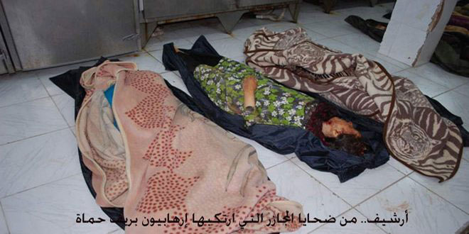 وارتكبت التنظيمات الإرهابية في الـ 12 من الشهر الجاري مجزرة بشعة بحق أهالي بلدة الزارة في ريف حماة الجنوبي وقامت بأعمال قتل وخطف وتدمير وتخريب ونهب لمنازل المواطنين وممتلكاتهم بينما تواصل التنظيمات الإرهابية منذ أسابيع استهدافها الأحياء السكنية في حلب بالقذائف الصاروخية ما أدى إلى ارتقاء عشرات الشهداء وإصابة المئات أغلبهم من الأطفال والنساء واضرار جسيمة بالممتلكات والبنى التحتية.