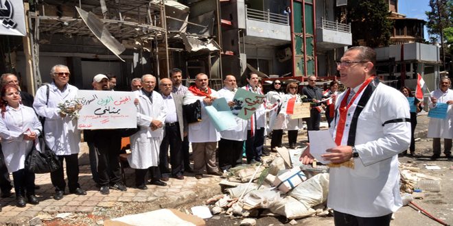 نفذ أطباء حلب اليوم وقفة تضامنية أمام مشفى ضبيط بحي المحافظة عبروا من خلالها عن استنكارهم للجرائم التي ترتكبها التنظيمات الإرهابية المسلحة بحق حلب وأهلها ومنها استهداف مشفى ضبيط بالقذائف الصاروخية ما أدى لارتقاء أربعة شهداء بينهم ثلاث نساء وجرح 19 آخرين.