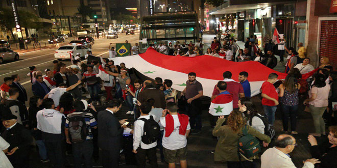 عبر أبناء الجالية السورية في مدينة سان باولو البرازيلية خلال وقفة تضامنية عن استنكارهم للعدوان الثلاثي الأخير على سورية منوهين ببطولات الجيش العربي السوري في مواجهة الإرهاب.