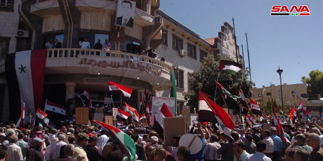 وعقب الوقفة توجه المشاركون في مسيرة جابت وسط المدينة مروراً بساحة السيد الرئيس مرددين الهتافات والشعارات الوطنية وموجهين التحية للجيش العربي السوري وتضحياته في مواجهة الإرهاب والعدوان ولأهلنا الصامدين في الجولان العربي السوري المحتل ولقائد الوطن ومؤكدين الوقوف خلف قيادته حتى تحقيق النصر المؤزر وتطهير كل شبر من أرض الوطن من براثن الإرهاب وأدواته ورعاته وتحرير كل أراضينا المحتلة.