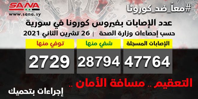 وأوضحت الوزارة في بيان تلقت سانا نسخة منه اليوم أن عدد الإصابات المسجلة في سورية بلغ حتى الآن 47764 شفيت منها 28794 حالة وتوفيت 2729 حالة.