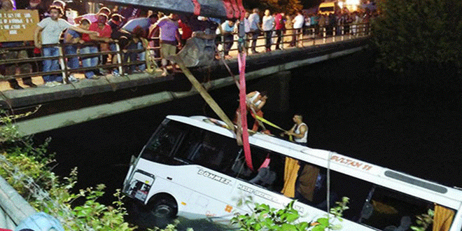 لقي 14 شخصا بينهم ستة أطفال مصرعهم وأصيب 24 آخرون بجروح جراء سقوط حافلة في قنال جنوب تركيا.