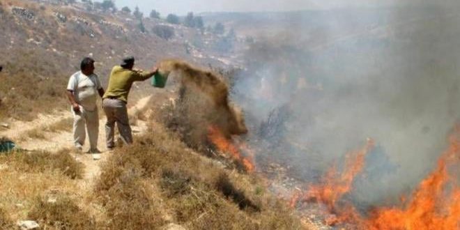 اعتدى مستوطنون إسرائيليون اليوم على أراضي الفلسطينيين الزراعية في بلدة برقة شمال نابلس بالضفة الغربية وأضرموا النار فيها.