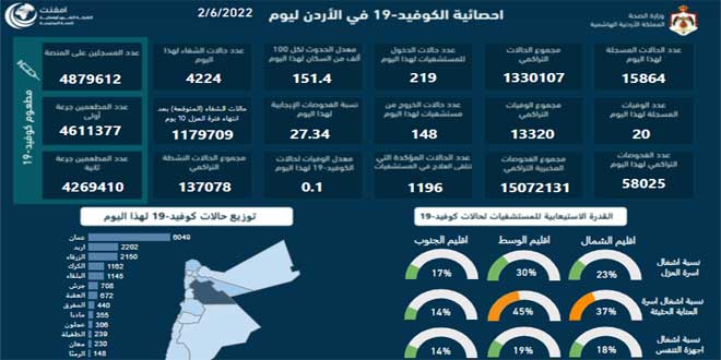 سجل الأردن 20 وفاة و15864 إصابة جديدة بفيروس كورونا خلال الساعات الأربع والعشرين الماضية.