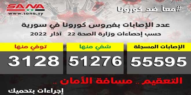 وأوضحت الوزارة في بيان تلقت سانا نسخة منه أن عدد الإصابات المسجلة في سورية بلغ حتى الآن 55595 شفي منها 51276 حالة وتوفي 3128 حالة.