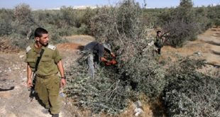 القدس المحتلة-سانا اقتحم مستوطنون إسرائيليون اليوم أراضي الفلسطينيين في مدينة بيت لحم بالضفة الغربية واقتلعوا عشرات أشجار الزيتون. وذكرت وكالة وفا أن مجموعة من المستوطنين اقتحمت قرية الولجة شمال غرب المدينة بحماية قوات الاحتلال واقتلعت 70 شجرة زيتون. ويواصل المستوطنون …