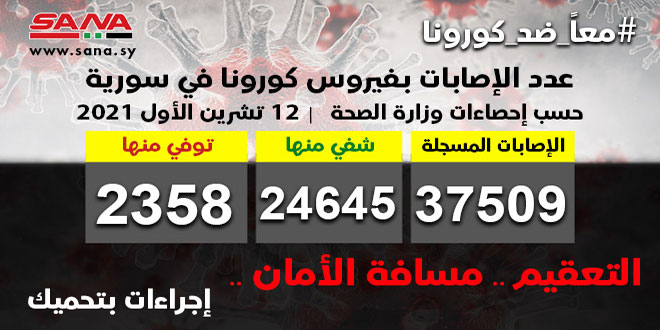 وأوضحت الوزارة في بيان تلقت سانا نسخة منه أن عدد الإصابات المسجلة في سورية بلغ حتى الآن 37509 شفيت منها 24645 حالة وتوفيت 2358 حالة.