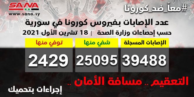 وأوضحت الوزارة في بيان تلقت سانا نسخة منه أن عدد الإصابات المسجلة في سورية بلغ حتى الآن 39488 شفيت منها 25095 وتوفيت 2429 حالة.