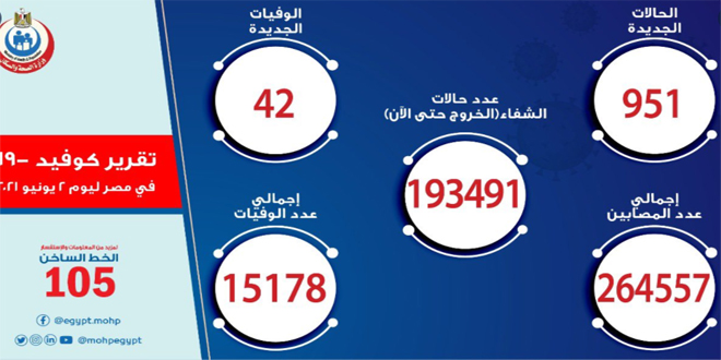 وذكر مساعد وزيرة الصحة المصرية خالد مجاهد أن إجمالي الإصابات بالفيروس بلغ 264557 توفيت منها 15178 وشفيت 193491 حالة .
