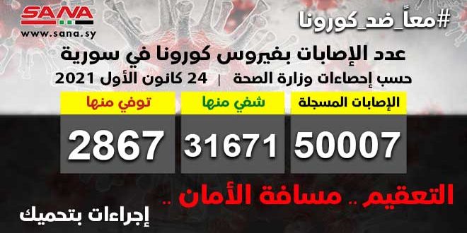 وأوضحت الوزارة في بيان تلقت سانا نسخة منه أن عدد الإصابات المسجلة في سورية بلغ حتى الآن 50007 شفيت منها 31671 حالة وتوفيت 2867 حالة.
