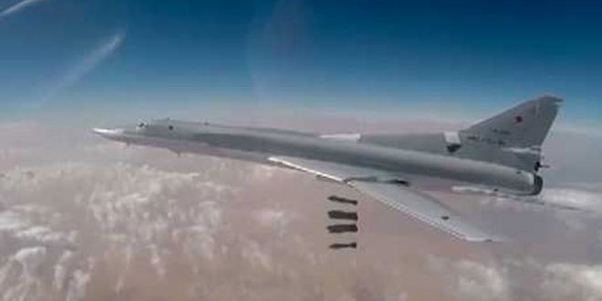 وكانت 6 قاذفات روسية بعيدة المدى من طراز تو 22 أم 3 وجهت ضربة أمس الأول إلى مواقع تنظيم “داعش” الإرهابي في ريف دير الزور وتمكنت من تدمير مواقع محصنة لإرهابيي التنظيم التكفيري ومعدات تابعة لهم.