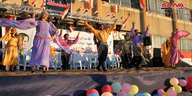 وافتتحت فرقة الفنون الشعبية “إيل ياما” التابعة لاتحاد شبيبة الثورة اليوم الأول للمهرجان بتقديم عرض مسرحي استعراضي بعنوان “خبطة قدمكم” الذي تضمن لوحات راقصة تحاكي تاريخ سورية ورجالاتها الأبطال إضافة إلى لوحة عن الشهداء وفقرة عن الجولان السوري المحتل ليبقى حاضراً في أذهان الأجيال القادمة كما قال محمود رسلان مدير الفرقة مضيفاً إن المهرجانات تسهم في تعريف الجمهور بالفرقة والمواهب الشعبية فيها.