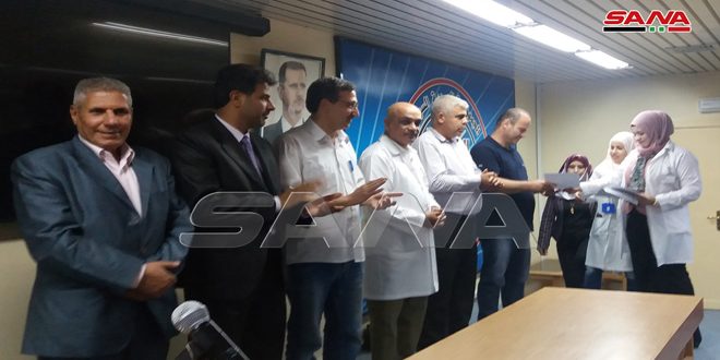 كرمت محافظة القنيطرة ونقابة التمريض والمهن الصحية والخدمات الطبية اليوم عدداً من العاملين في قطاع التمريض في مشفى الشهيد ممدوح أباظة بمناسبة عيد التمريض العربي وتقديراً لجهودهم وذلك في قاعة المحاضرات بالمشفى.