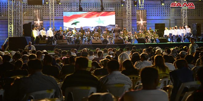 أحد أعضاء الفرقة تجاوز إصابته في بصره وقدم بصوت رخيم وأداء مبهر أغنية “حبيبي يا وطني” كما قدم أحد فرسان الفرقة من الجرحى مجموعة من مواويل العتابا التي تحض على محبة الوطن وتمجد بطولات الجيش العربي السوري وانتصاراته مقدمة لأغنية “عالشام خدوني”.