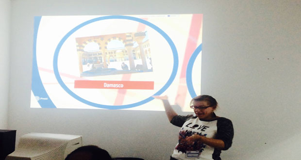 وعرضت نسرين في المحاضرة التي القتها امام جمع من الطلبة والمثقفين من دول العالم معلومات موثقة عن أماكن تاريخية وأثرية سورية مرافقة بصور عن الأحياء الدمشقية العريقة والمساجد والكنائس ودور العبادة التي تدل على الغني الفكري التي تتغنى به سورية عبر العصور.