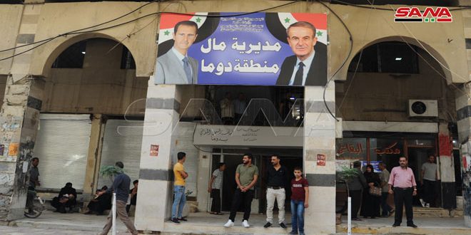 من جانبه بين مدير الضرائب والرسوم في منطقة دوما عبد الكريم الحسين أنه بعد دحر الجيش العربي السوري الإرهاب من دوما تم العمل على ترميم بناء مديرية المالية فيها لتكون جاهزة لاستقبال المواطنين والتخفيف من أعباء الذهاب إلى دمشق لإنجاز معاملاتهم وخلال فترة قصيرة تم إنجاز العمل وبدأت المديرية باستقبال المراجعين وتأمين الخدمات مثل الحصول على براءة الذمة والقيد العقاري والسجل المدني وغيرها.