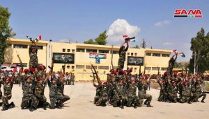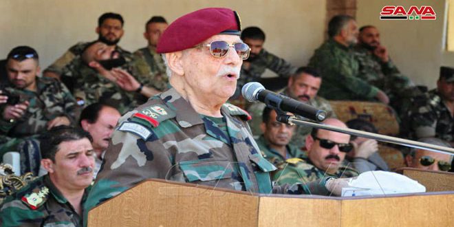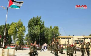 من جهته أكد العميد محمد طارق أبو سرور مدير المدرسة في كلمته خلال الاحتفال الذي تضمن عروضاً عسكرية مواصلة وقوف الشعب الفلسطيني مع الشعب السوري وقيادته في وجه ما تتعرض له سورية.