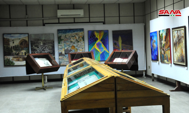 وتزينت جدران المعرض بلوحات لفنانين تشكيليين سوريين كبار عن الخط العربي ودمشق بدءاً بالبيوت الدمشقية القديمة وجبل قاسيون والأسواق الدمشقية.