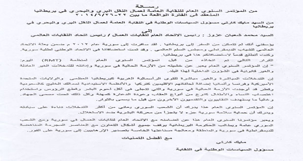 أكد المؤتمر السنوي العام للنقابة العامة لعمال النقل البري والبحري في بريطانيا “أن حماية سلامة سورية جزء لا يتجزأ من معركة البشرية ضد الاستغلال وأن الشعب السوري يعاني من أكثر التدخلات دناءة على سيادته” معربا عن إدانته لجميع تلك التدخلات غير العادلة وغير القانونية في الشؤون الداخلية لهذا البلد.
