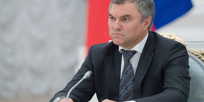 أكد رئيس مجلس الدوما الروسي فياتشيسلاف فولودين ضرورة التمسك بمبادئ عدم التدخل في شؤون الدول ذات السيادة ومنع العمل وفق المعايير المزدوجة.