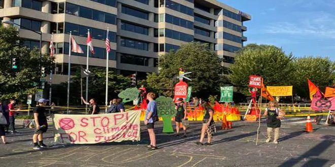 أغلق ناشطون محاور طرق رئيسية في العاصمة الأمريكية واشنطن وشكلوا سلسلة بشرية وربطوا أنفسهم بمركب شراعي في إطار مساعيهم للضغط على الساسة الأمريكيين لمكافحة تغير المناخ.
