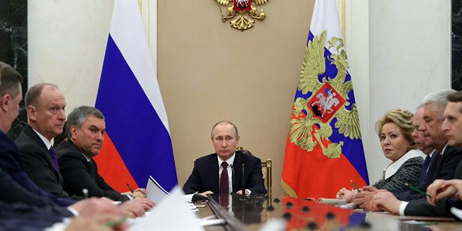ناقش الرئيس الروسي فلاديمير بوتين مع الأعضاء الدائمين في مجلس الأمن الروسي آفاق تطور عملية تسوية الأزمة في سورية وقضايا التنمية الاجتماعية والاقتصادية في روسيا.